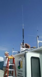 A few years back, CCECPSCO members installed the new Tarheel “screwdriver” antenna on top of the communications trailer. The antenna is mounted to a repurposed satellite antenna mount to provide motorized deployment and storage of the antenna. In the standard configuration the antenna includes the motorized coil section, a short mast, a capacity hat, and a large whip. Other whip configurations have been donated to provide better operation on both lower and higher bands.