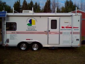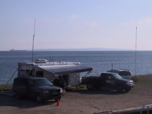 The CCECPSCO Communications Trailer during Field Day 2009 in Mackinaw City. The racks and antennas were installed by the time of this picture. Additional antennas have been added since. The HF vertical at the right is one of the HF antennas that stores in the trailer when not in use.